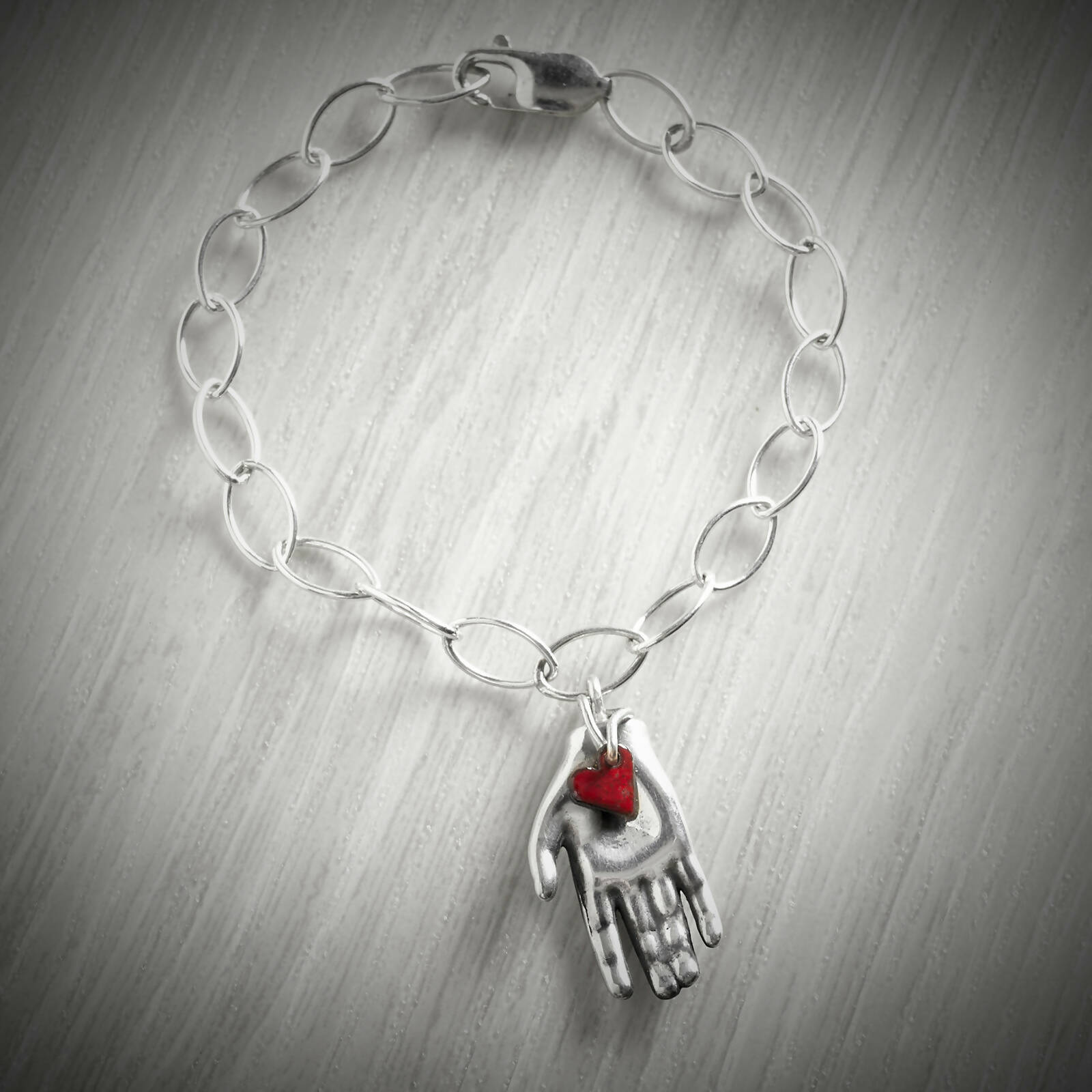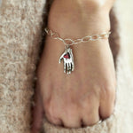 A beautiful symbol of protection and love. The red enamel heart is suspended in the palm of this solid silver hand. The hand was originally inspired by the traditional Middle Eastern symbol of Fatima's hand. A symbol of guidance and protection. This silver bracelet hangs beautifully on your wrist.