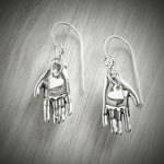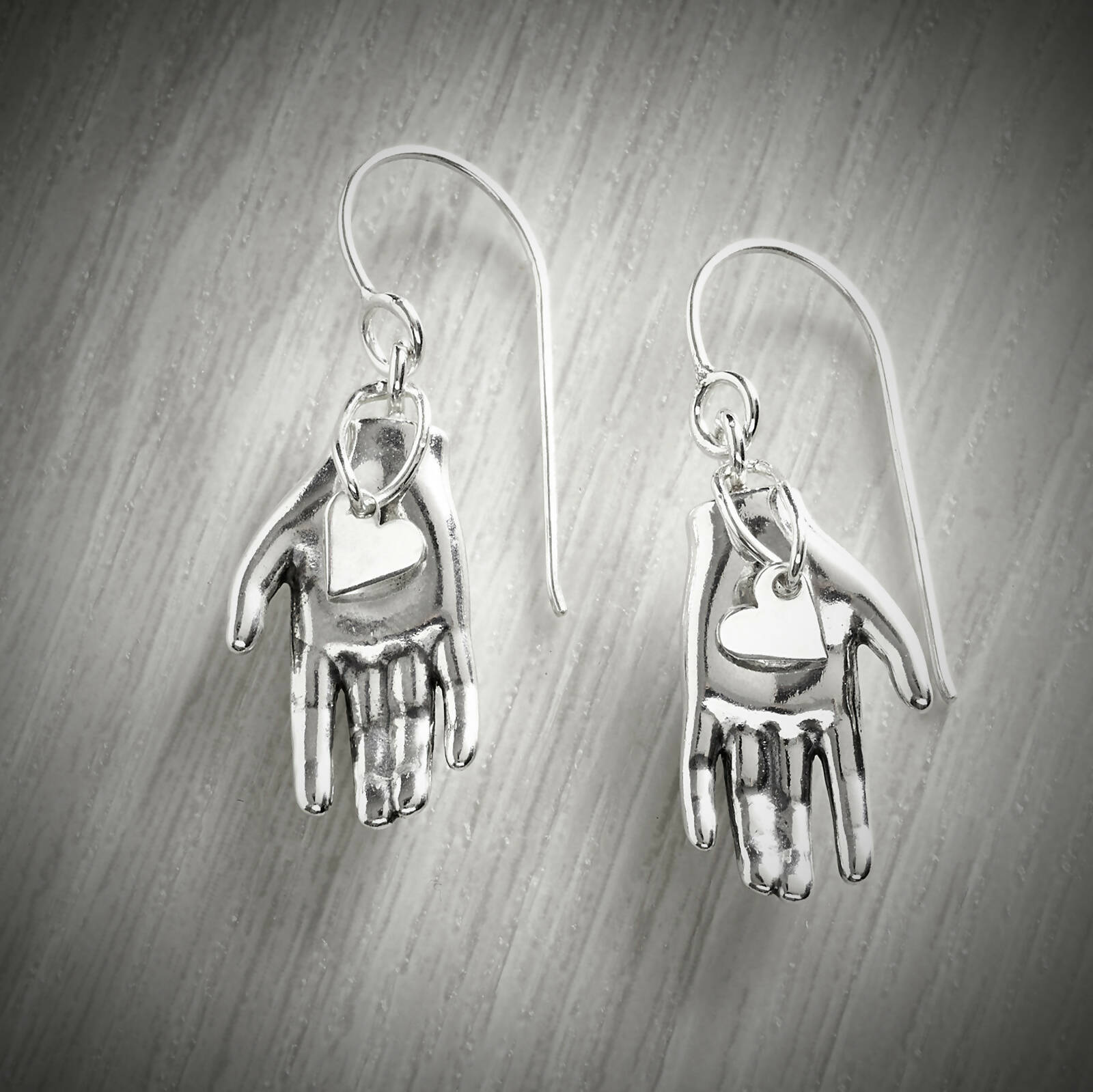 These beautiful silver earrings are a winsome symbol of protection and love. The dainty silver heart is suspended in the palm of this solid silver hand. The hand was originally inspired by the traditional Middle Eastern symbol of Fatima's hand - a symbol of guidance and protection.