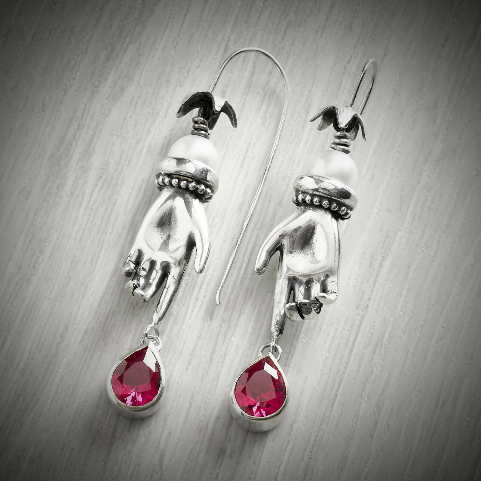 A stunning statement earring. A teardrop ruby drips off the end of a finger, this earring is about passion and lust and love. Trimmed with a beaded 'bracelet' detail and a AAA Akoya pearl, hung on a silver hook. This earring has lovely movement and swing.