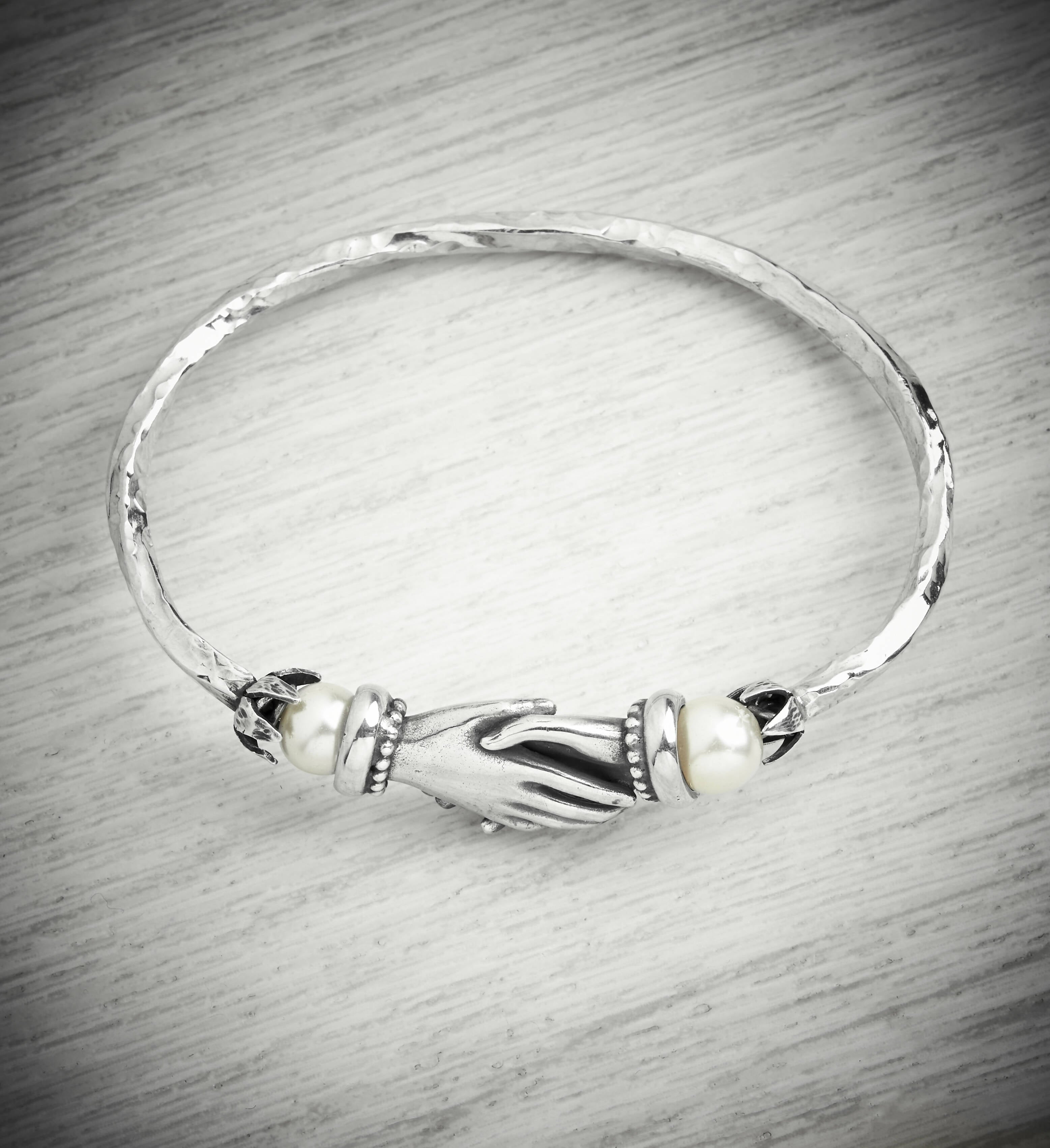 The bangle, with Emma's signature twisted wire winds around the wrist. The hands clasp at the front with stunning Akoya pearls where the bangle meets the clasped hands.