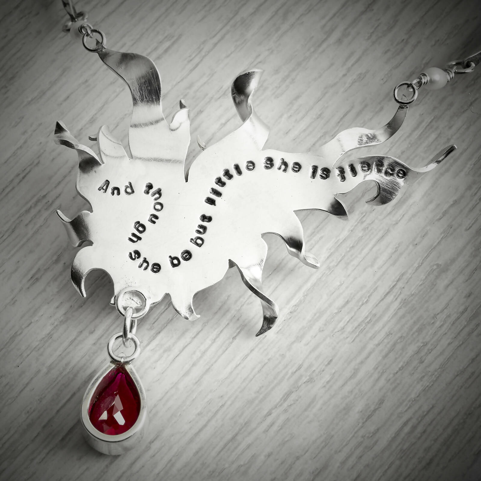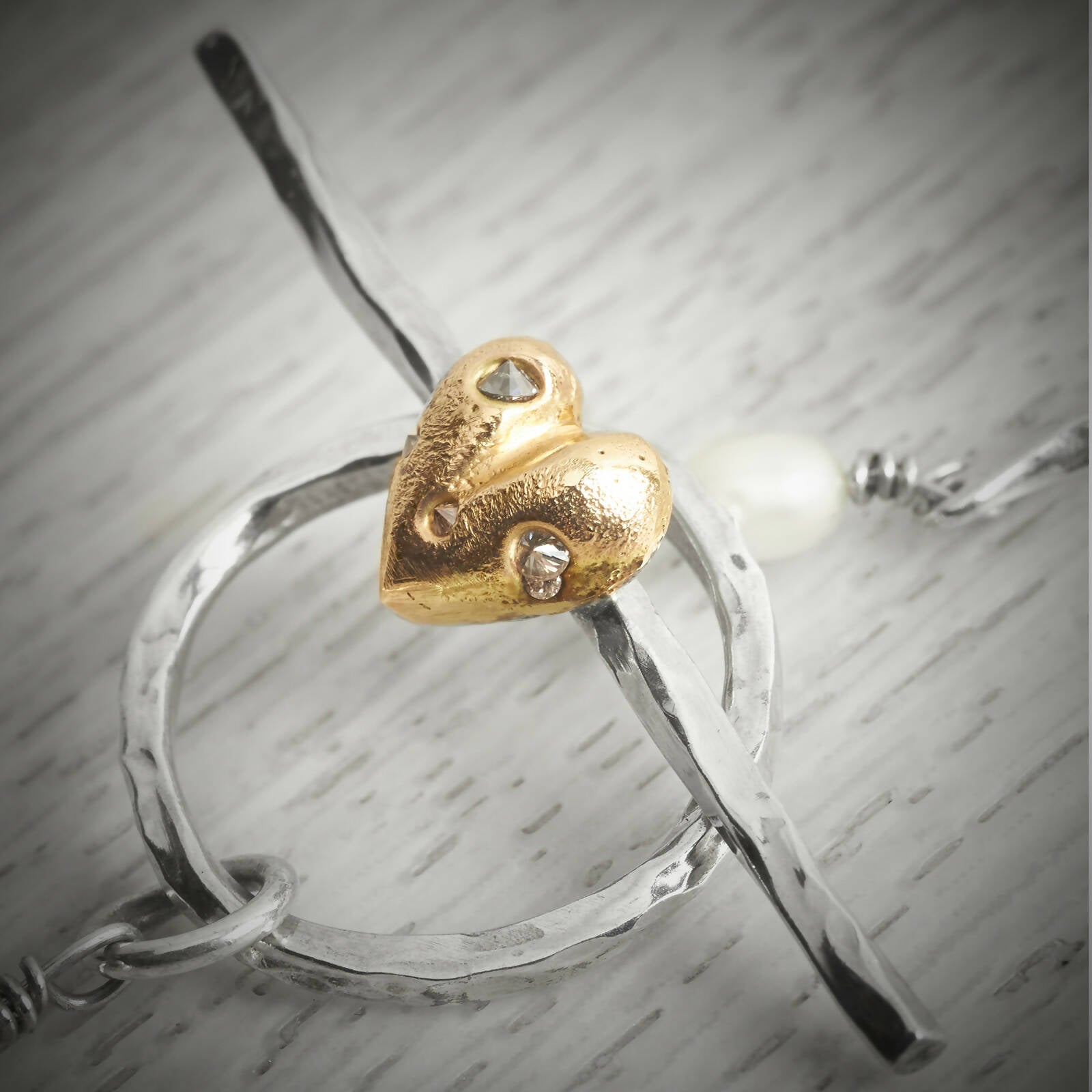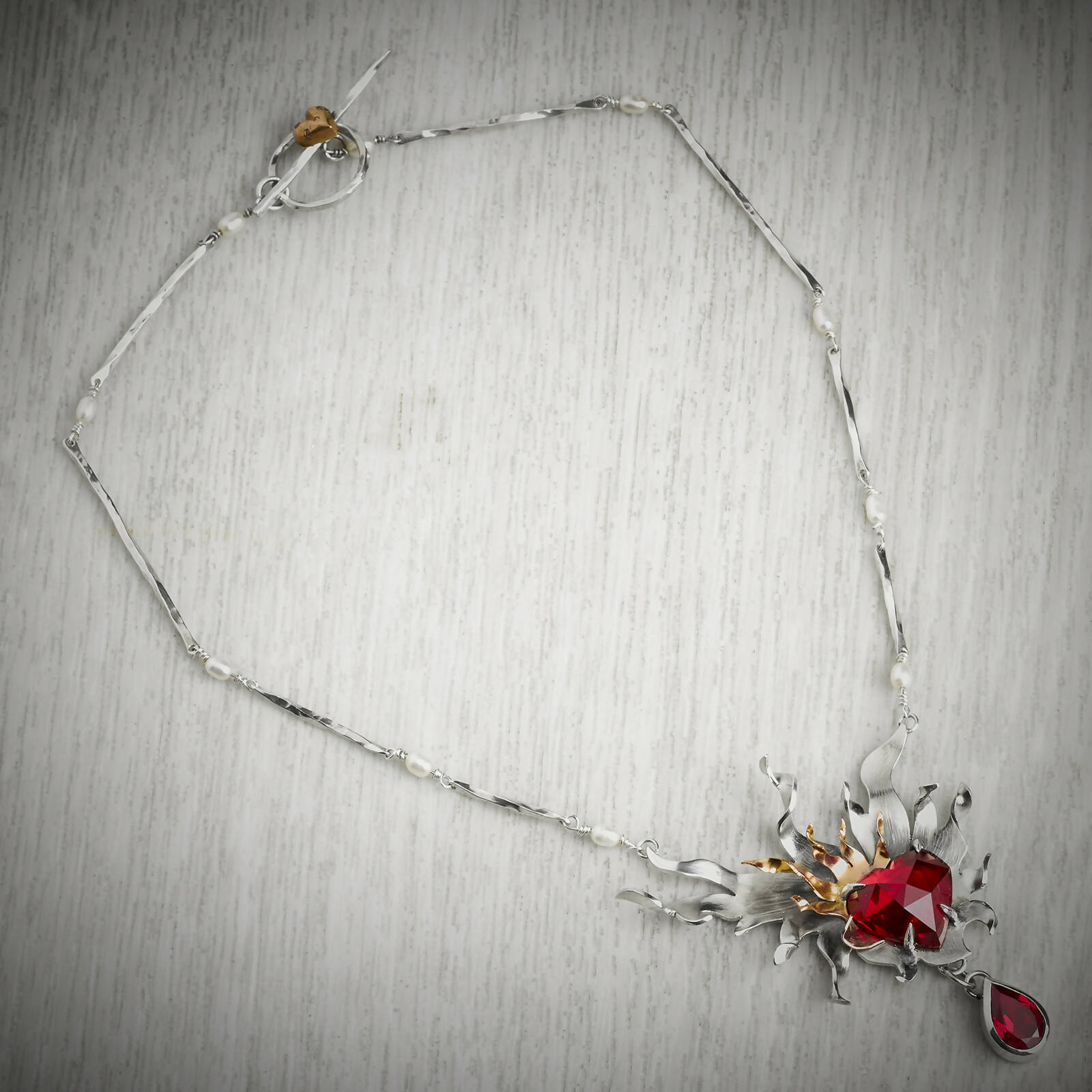 The Rumba Necklace - Love on fire! This breathtaking piece, as seen on TV, was inspired by the incredible Shirley Ballas, dancer, author and head judge on TV's Strictly come dancing. It emanates romance, passion, connection and power. Flames of 9ct rose gold surround a stunning faceted heart-shaped ruby, with twists of silver dancing sensually towards a chain of freshwater pearls and twisted bars of silver. The T-bar clasp is silver with the addition of a 9ct gold heart embedded with diamonds. This exquisite necklace is sure to turn heads and break hearts.