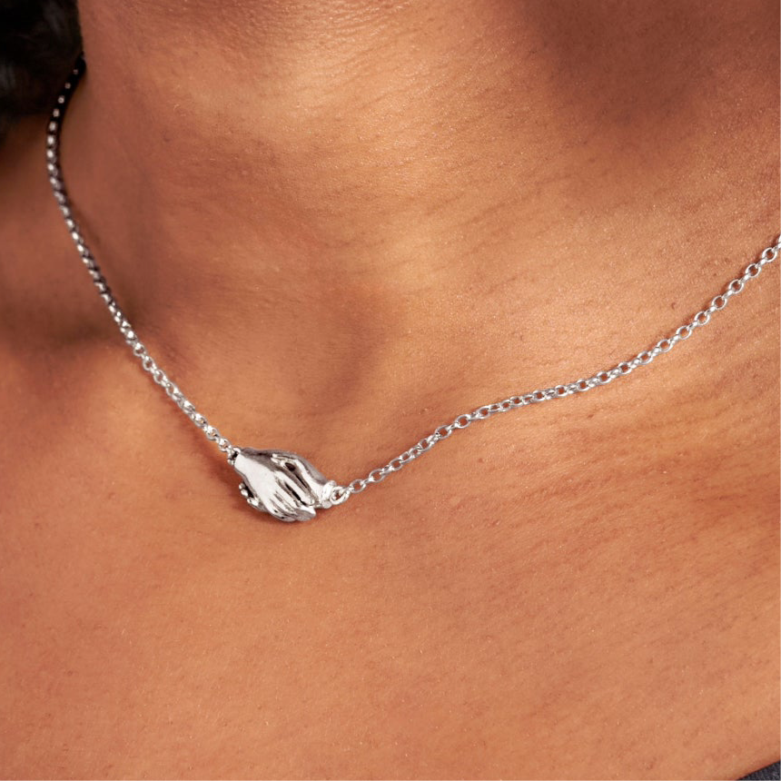 This sterling silver choker is going to be a sellout. Clasped hands are the focal point for this beautiful choker that nestles into your collarbone creating one of the hottest jewellery looks.