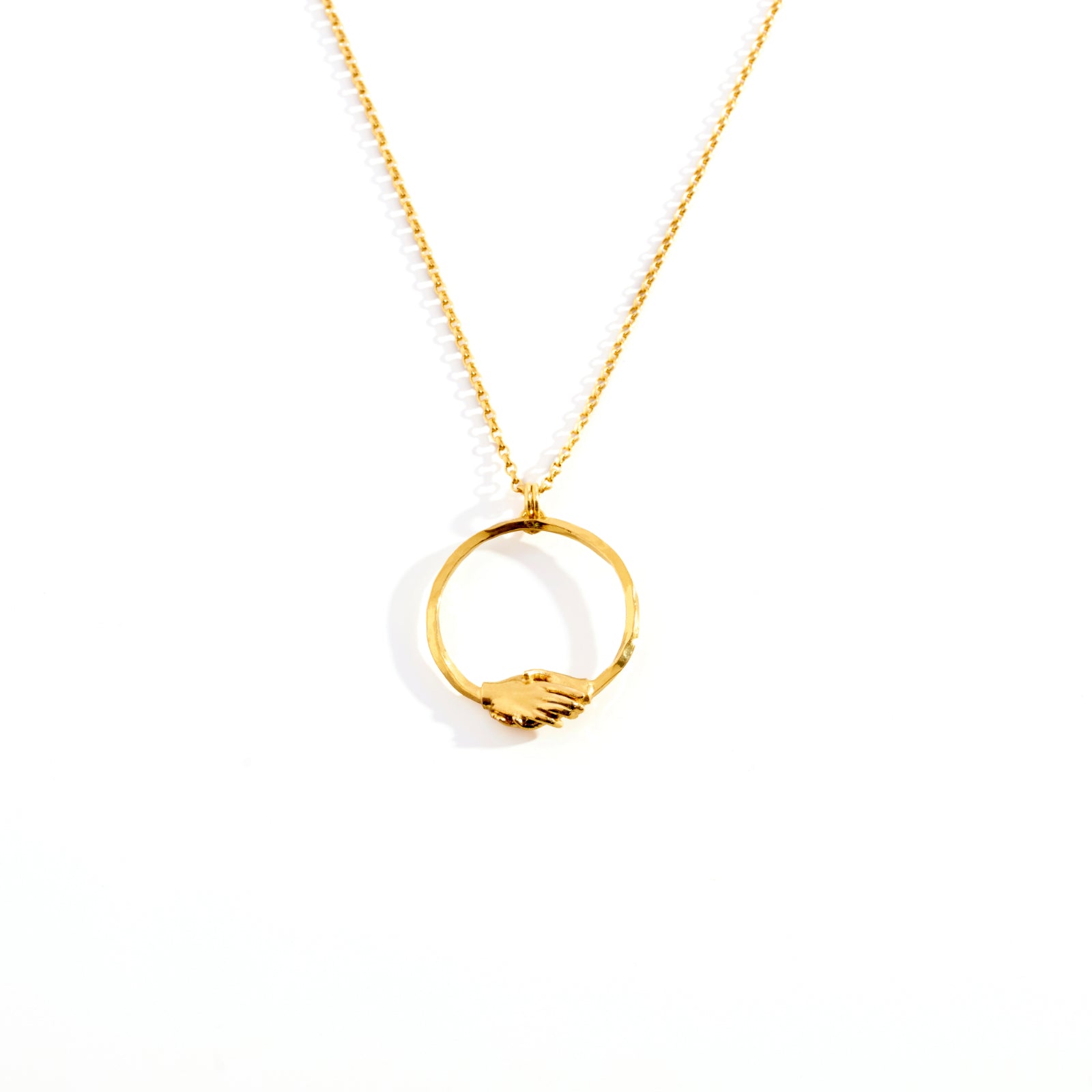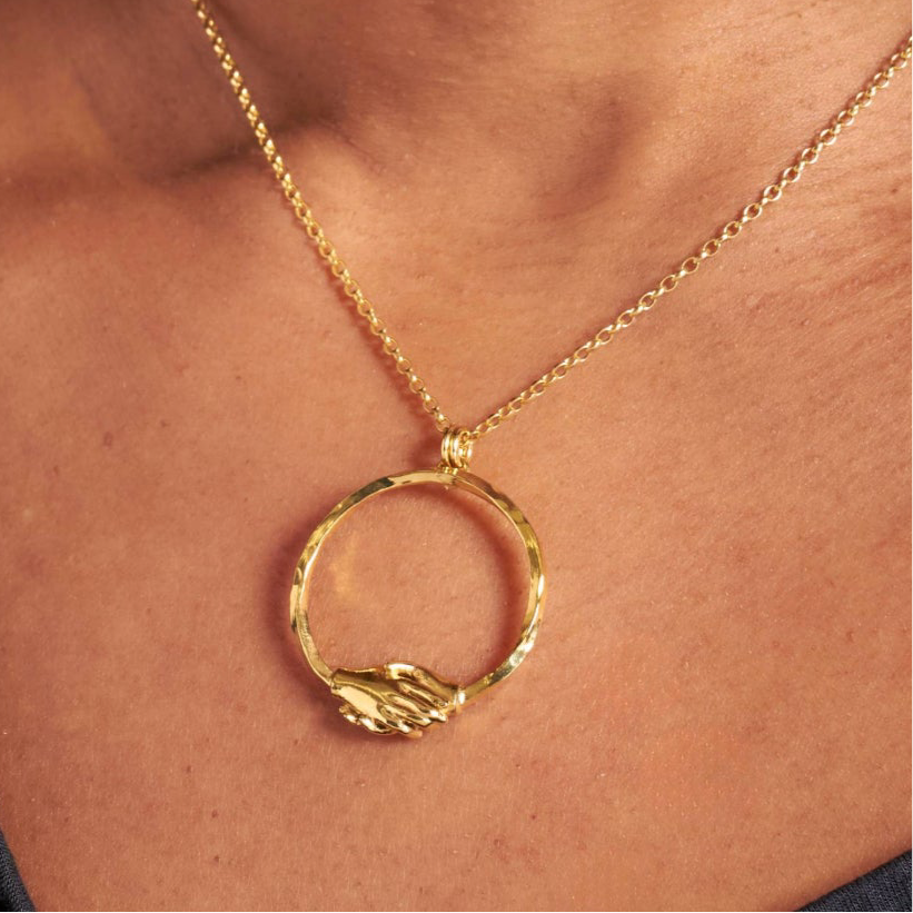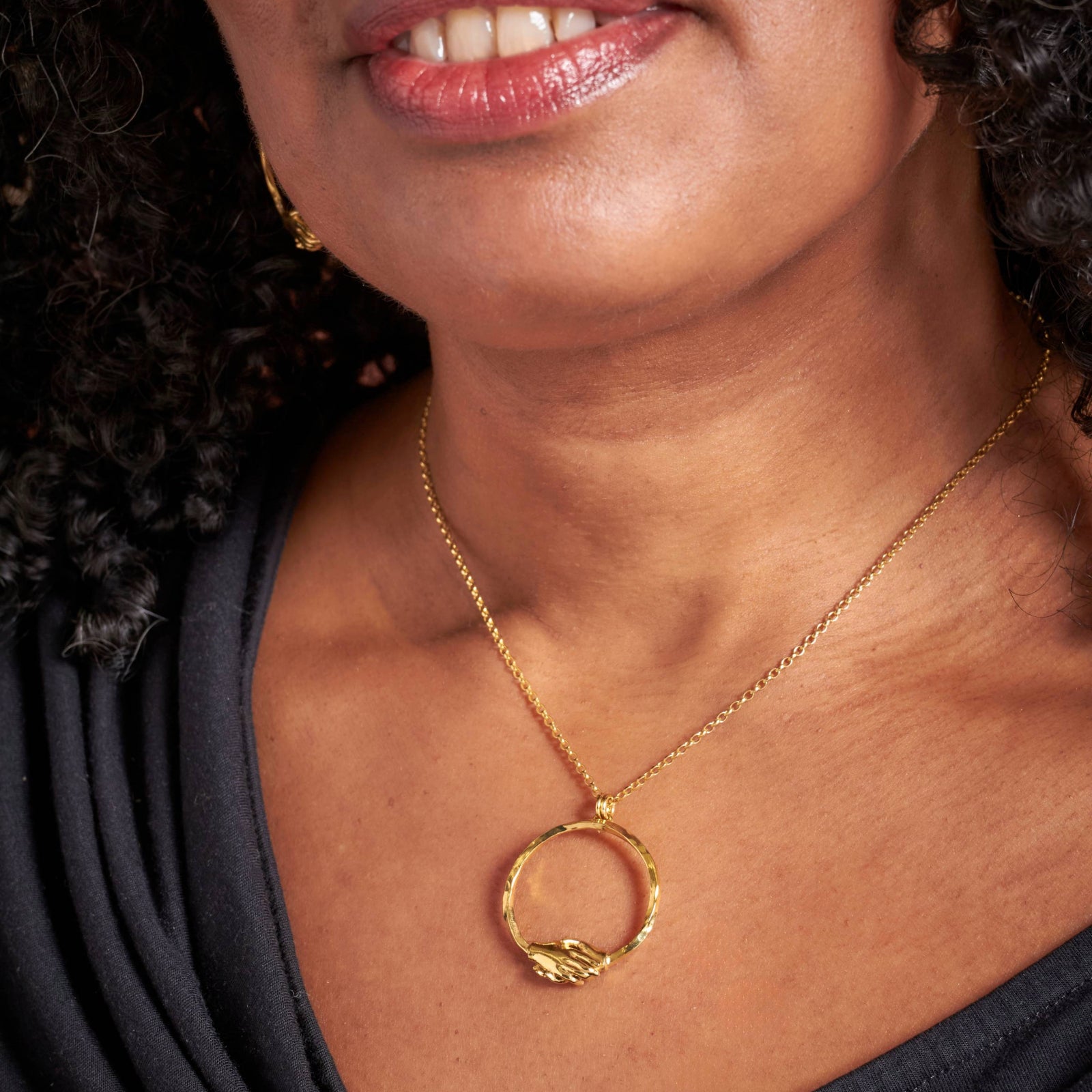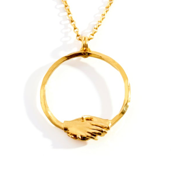 This large 18ct gold vermeil twisted wire circle with clasped hands entwined together will hold a special place against your body.