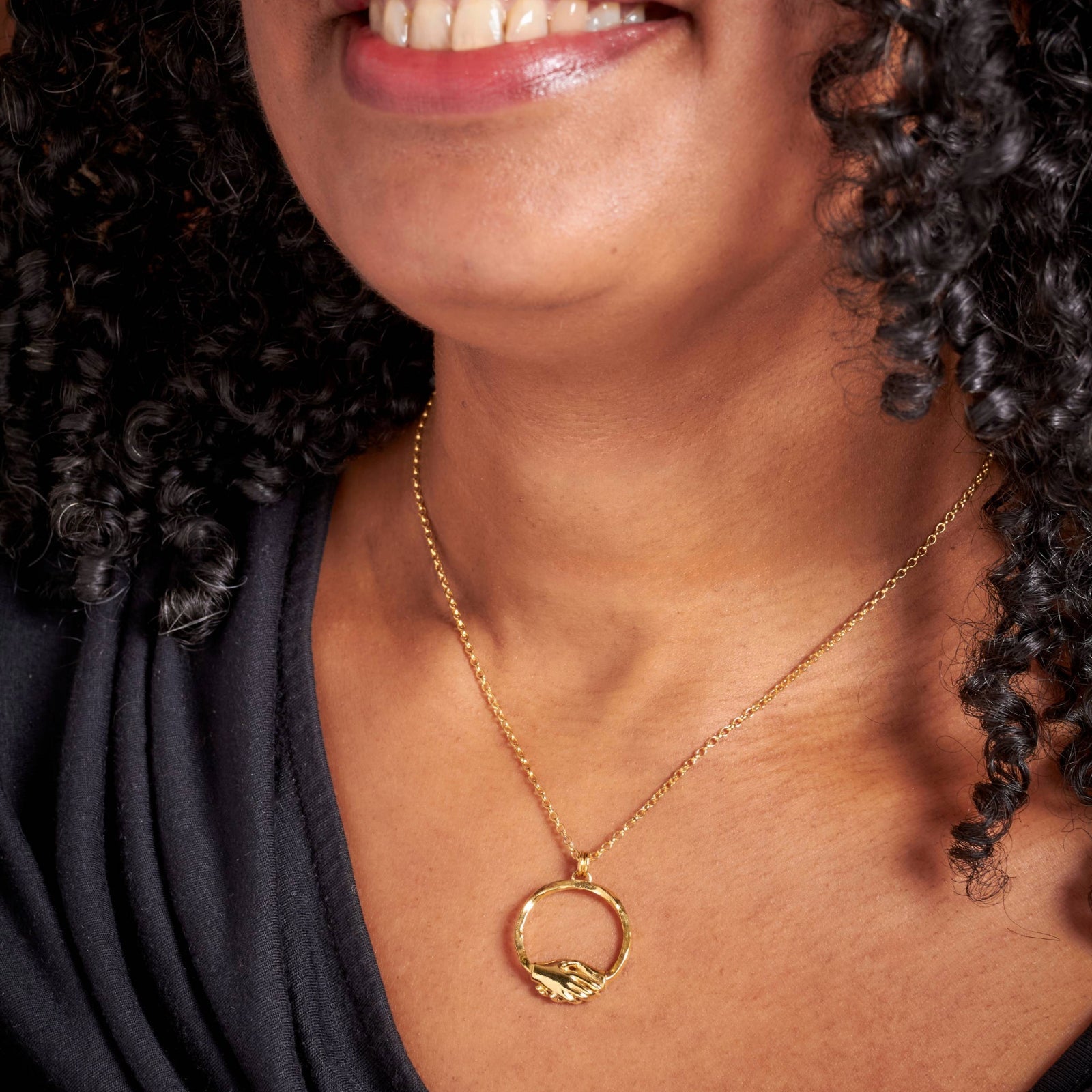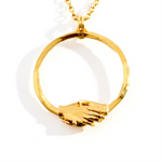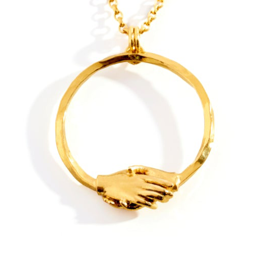 Beautiful 18ct gold vermeil coats the silver twisted wire. A perfect circle with clasped hands, holding on tightly. Promising to be there always.