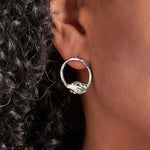 Silver stud earrings, twisted and hammered in the shape of a circle with clasped hands together forever. Promising to always be there.