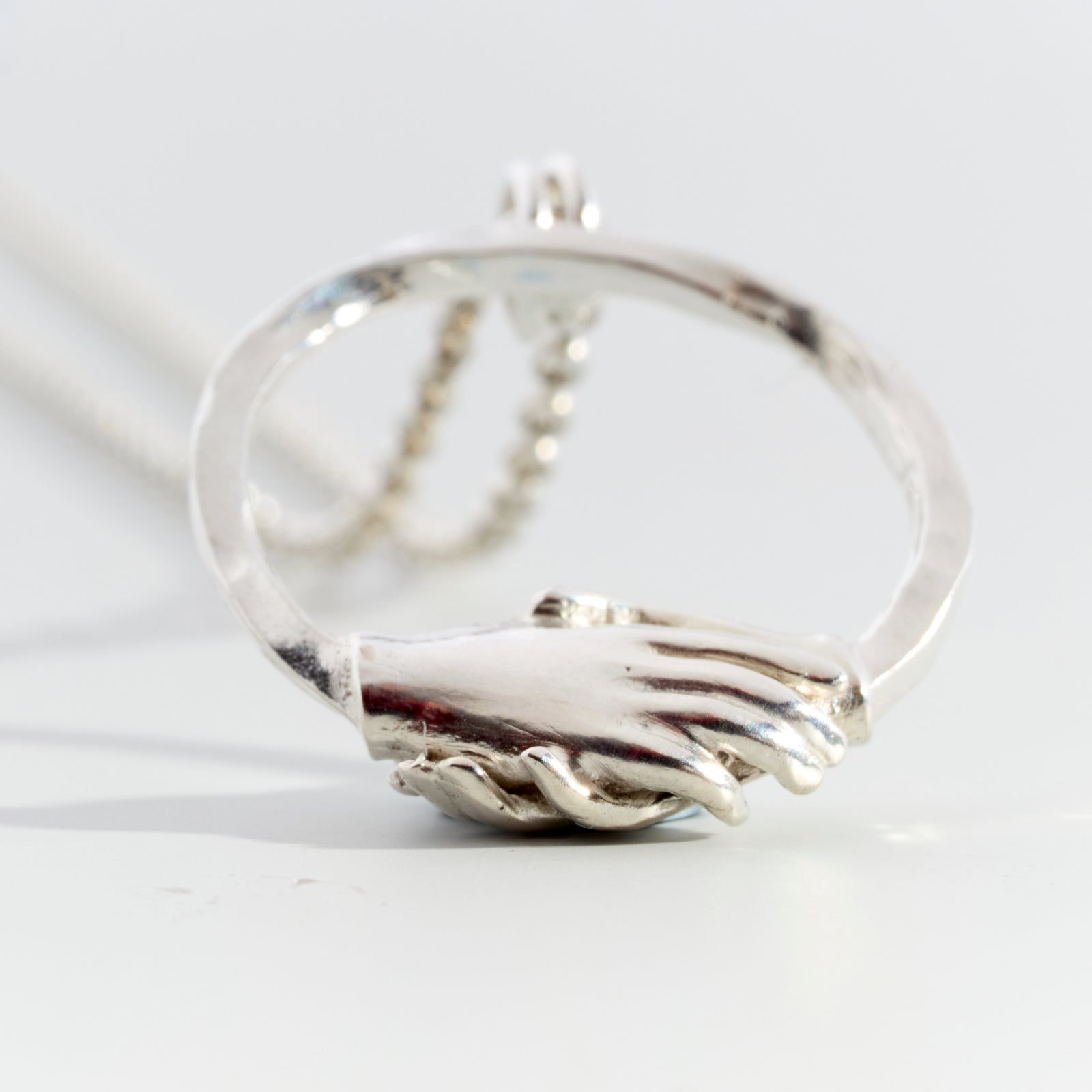 Silver twisted and hammered wire shaped into a circle with clasped hands. A true circle of trust.